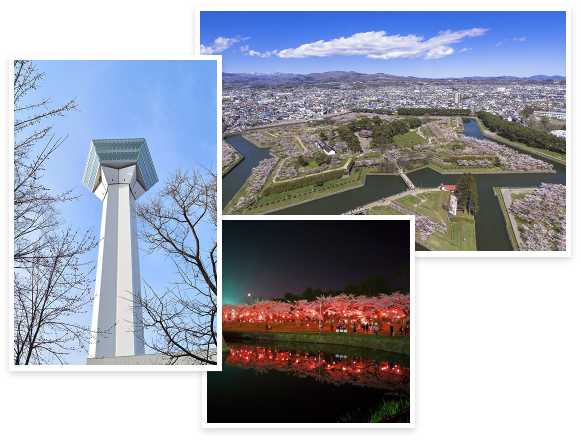 1864年に完成した国内発の西洋式城郭として国の特別史跡に指定されています。幕軍と官軍の最期の戦いである箱館戦争の舞台となったことでも有名です。4月下旬からはソメイヨシノが一斉に咲き誇る桜の名所として、冬はお堀がライトアップされるなど、多くの人で賑わう道内有数の観光スポットです。近くにある五稜郭タワーでは函館山や津軽海峡、五稜郭の眺望が楽しめます!